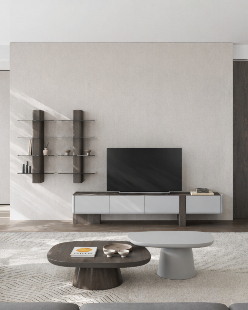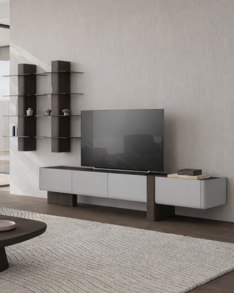 Die großzügigen, integrierten Schubladen bieten praktischen Stauraum für Multimedia-Zubehör, Dokumente oder persönliche Gegenstände und sorgen für eine aufgeräumte, harmonische Atmosphäre. Die breite Ablagefläche eignet sich ideal für TV-Geräte, Dekoration oder stilvolle Wohnaccessoires.
