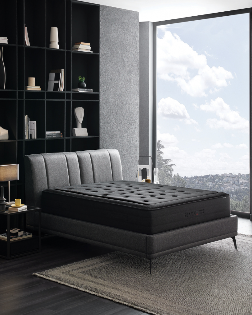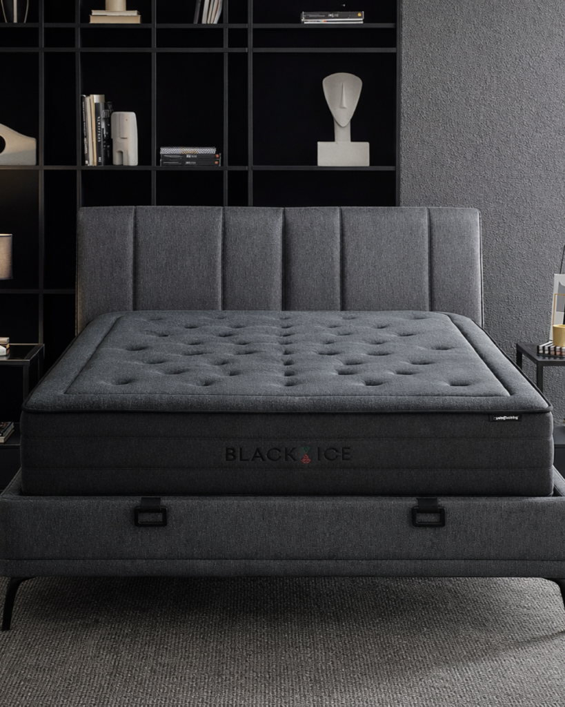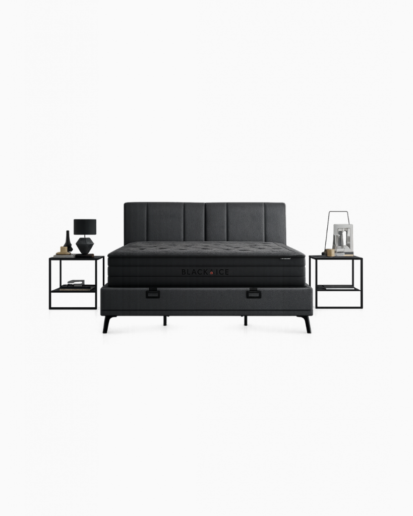 Das Black Ice Bett überzeugt nicht nur durch seinen erstklassigen Komfort, sondern hebt sich auch durch seinen kühlenden schwarzen Stoff hervor. In Kombination mit der speziell entwickelten Black Ice Bettbasis und dem Kopfteil schafft dieses Set einen ästhetischen und stilvollen Look in Ihrem Schlafzimmer.