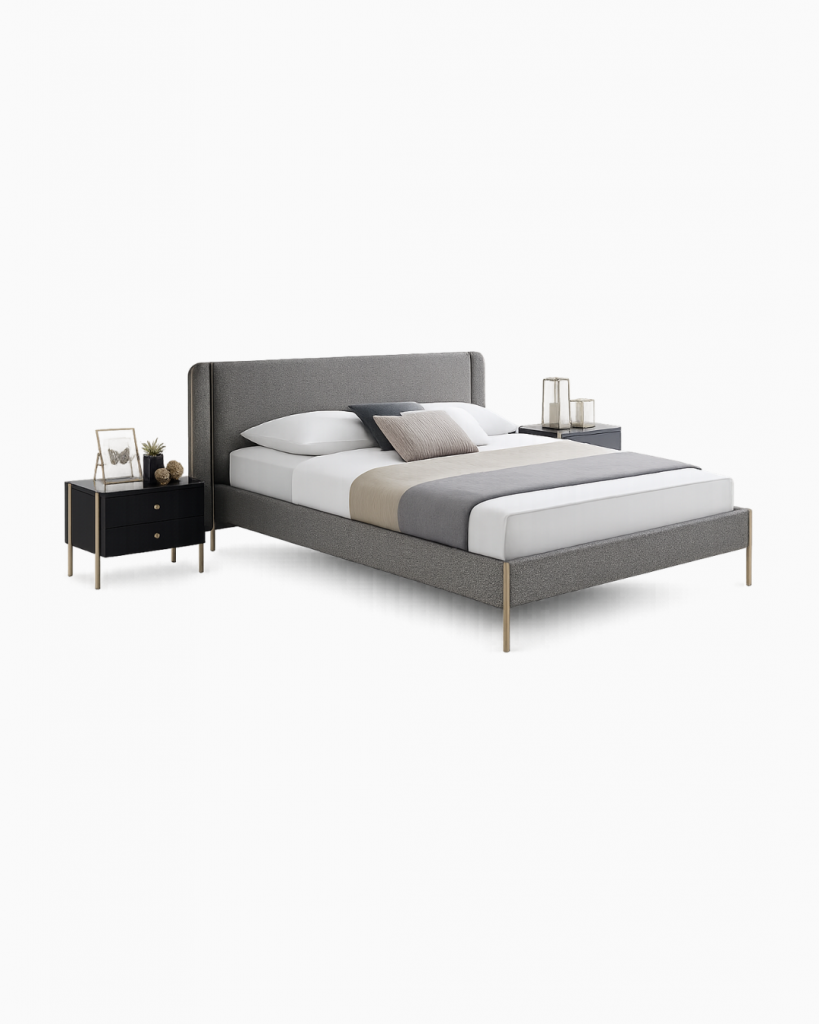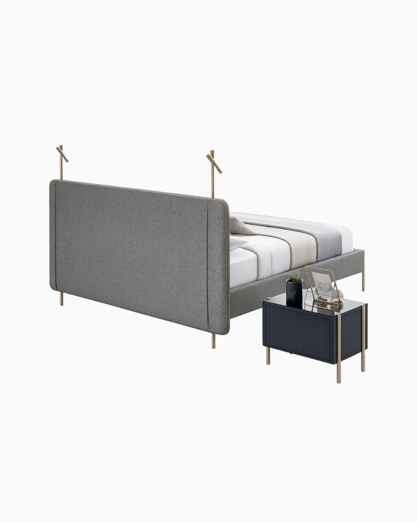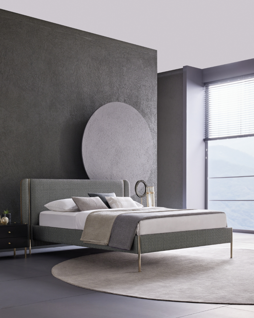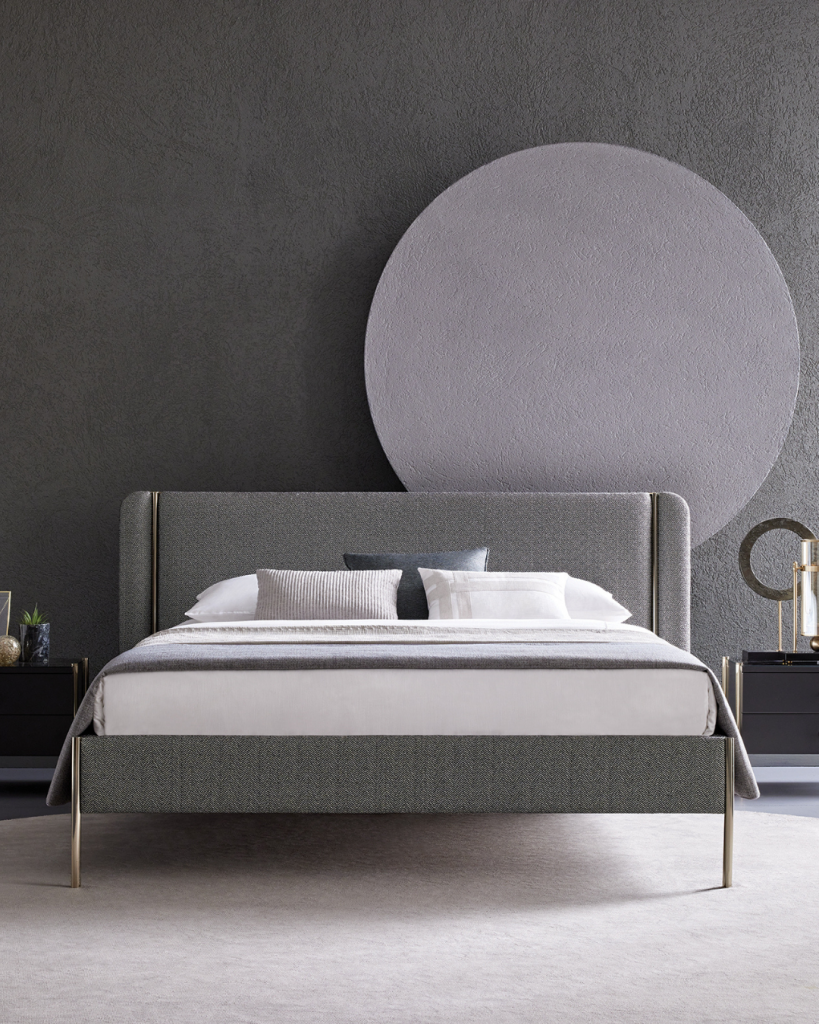 Das Inside Bettgestell verwandelt Schlafzimmer mit seinem italienischen Design in ein wahres Kunstwerk. Der Fischgrätstoff und die goldfarbenen Details machen das Inside Bett zu einer einzigartigen Wahl, um Eleganz und Stil ins Schlafzimmer zu bringen.