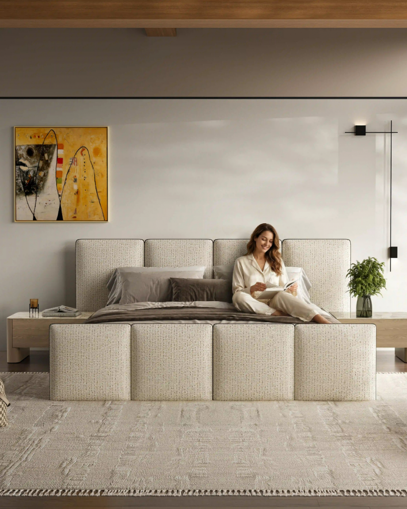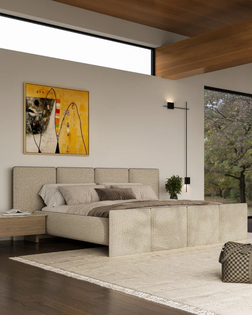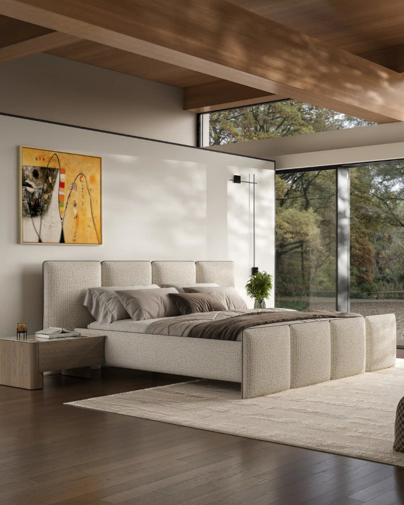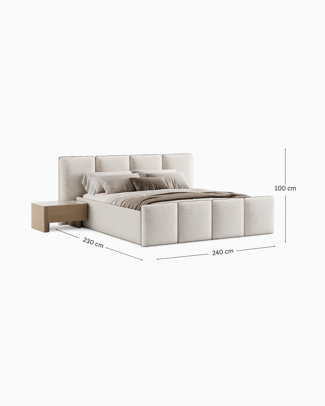Das weich gepolsterte Kopfteil mit rhythmisch angeordneten vertikalen Segmenten schafft ein Gefühl von Geborgenheit und visuellem Gleichgewicht. Die textile Bezugsausführung in einem hellen, neutralen Farbton fügt sich mühelos in moderne Wohnkonzepte ein. Das voluminöse Untergestell verleiht dem Bett Stabilität und unterstreicht seinen architektonischen Charakter.