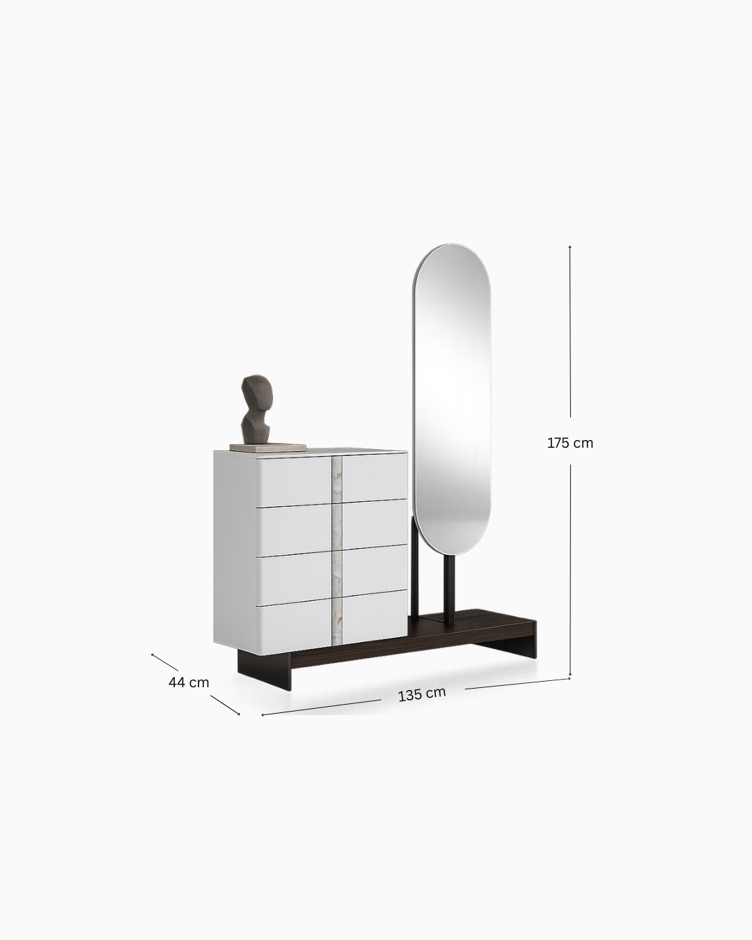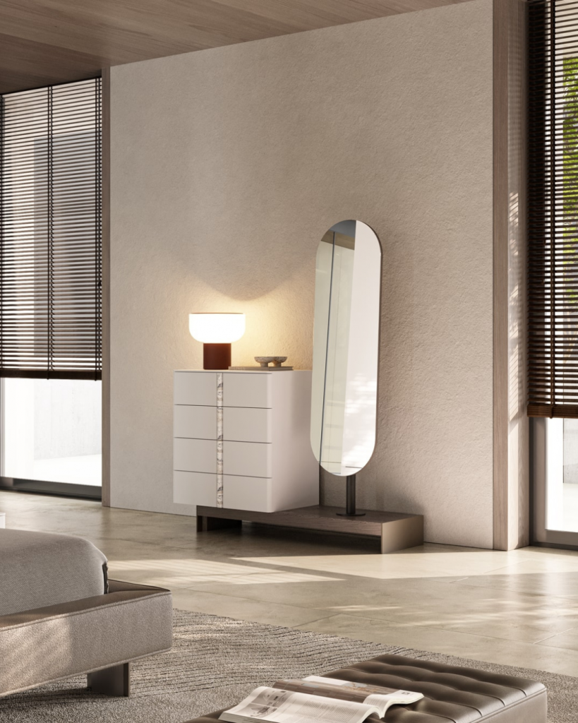 Darüber schwebt ein stilvolles Spiegelobjekt mit sanft gerundetem, bogenförmigem Rahmen, das auf einer schlanken Metallkonstruktion ruht. Dieses Detail verleiht der Komposition visuelle Leichtigkeit und eine ausgewogene Proportion.