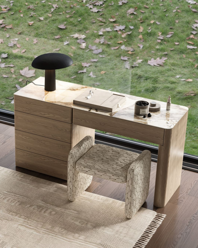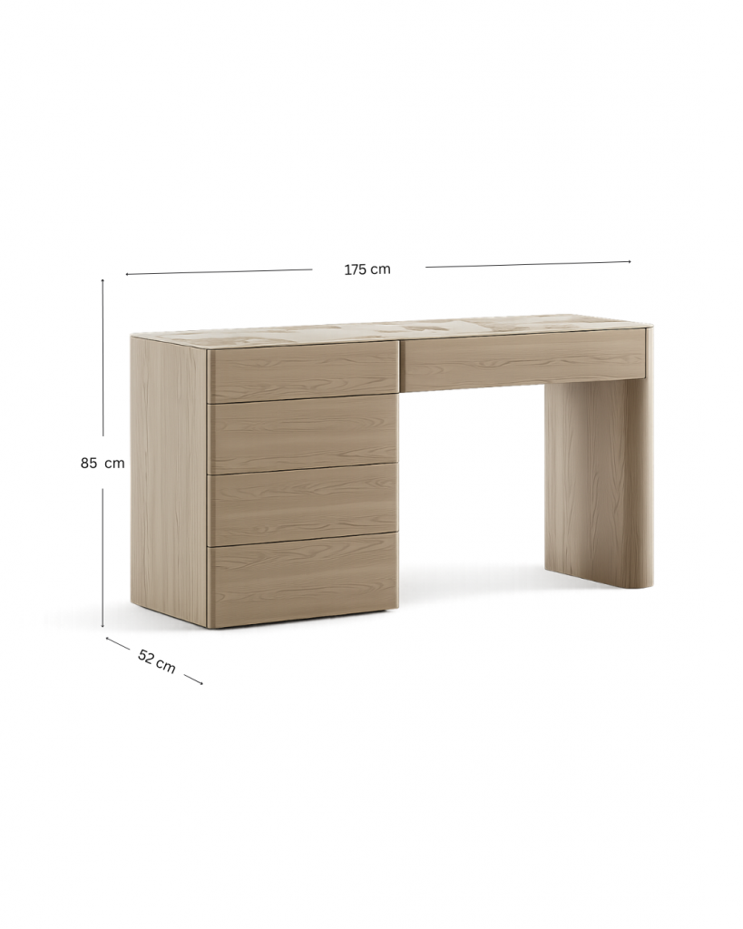 Klare Linien, eine warme Holzstruktur und ausgewogene Proportionen vermitteln eine ruhige, moderne Ästhetik. Geräumige Schubladen sind hinter einer minimalistischen Front verborgen und sorgen für Ordnung, ohne die visuelle Leichtigkeit zu beeinträchtigen. Die Keramik-Tischplatte unterstreicht den architektonischen Charakter des Modells und macht den Schminktisch zu einem vielseitigen Element im Schlafzimmer.
