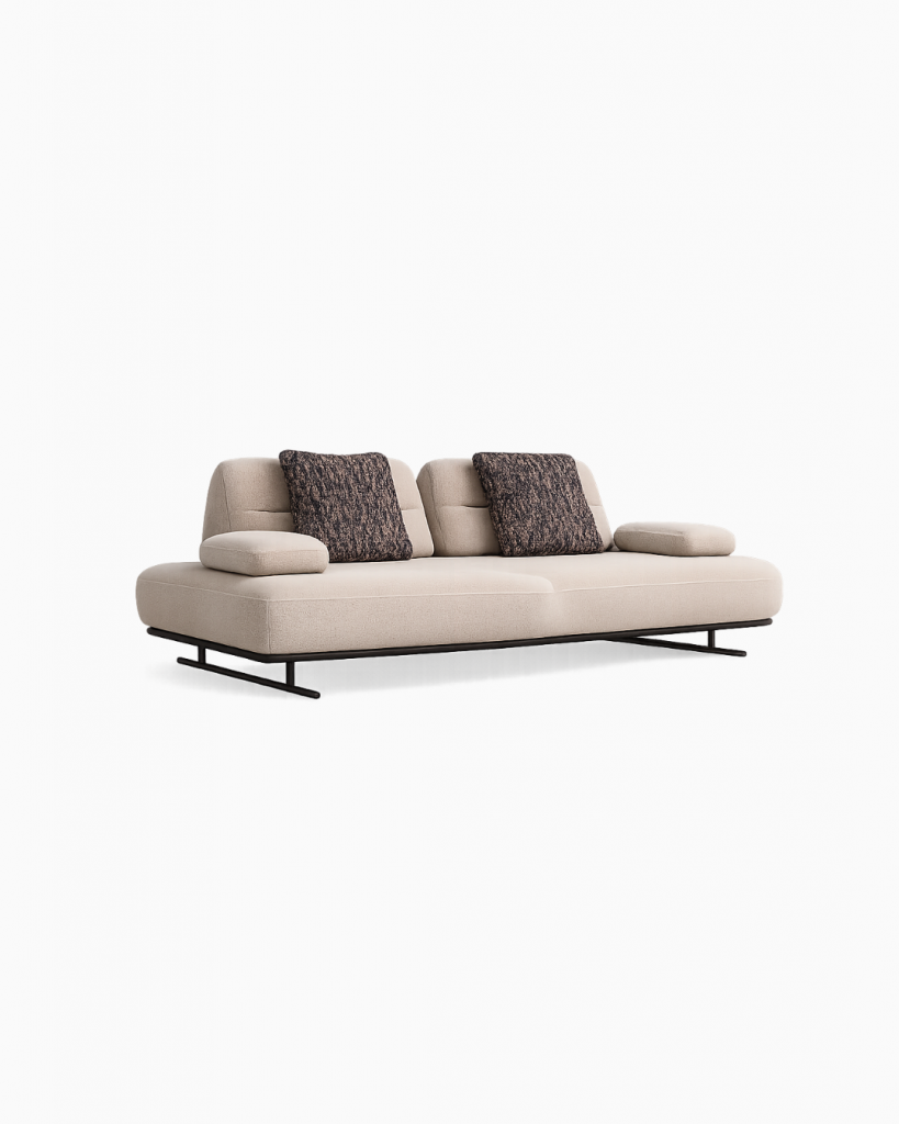Das Sofa ORCA verbindet funktionales Design mit durchdachter Konstruktion und hohem Komfort. Die klare Linienführung und die ausgewogenen Proportionen verleihen dem Sofa eine moderne, zurückhaltende Ausstrahlung, während seine flexible Bauweise ORCA zu einer vielseitigen Lösung für unterschiedliche Wohn- und Nutzungssituationen macht.  Die tragende Rahmenkonstruktion des Sofas ORCA besteht aus industriell standardisiertem, CNC-gefrästem Sperrholz der 1. Klasse, gezielt verstärkt mit massivem Buchenholz. Diese Materialkombination sorgt für ein optimales Verhältnis von geringem Gewicht und hoher Belastbarkeit sowie für Stabilität, Formbeständigkeit und Langlebigkeit.  Im Sitzbereich kommt ein elastisches Trampolin-System zum Einsatz, das eine gleichmäßige Federung gewährleistet und den Sitzkomfort nachhaltig unterstützt. Das Hauptsitzpolster besteht aus 10 cm starkem Forta-Schaum mit einer Dichte von 32 DNS, ergänzt durch 5 cm CNC-gefrästen Daunenschaum. Dieser mehrschichtige Aufbau bietet eine ausgewogene Kombination aus stabiler Unterstützung und angenehmer Weichheit. Eine 300 g/m² laminierte Vliesauflage verleiht dem Sitz eine hochwertige Haptik und zusätzliche Komfortschichten.  Ein besonderes Merkmal des Sofas ORCA ist die funktionale Konstruktion von Rücken- und Armlehnen, die transporttechnisch separat vom Sitz lösbar sind. Diese Eigenschaft ermöglicht die einfache Umwandlung des Sofas in ein komfortables Einzelbett und erleichtert zugleich Handling, Transport und Logistik.  Das Sofa ORCA steht auf metallischen Füßen mit rauchfarbener Lackierung. Mit einer Höhe von 12 cm und einer Materialstärke von 25 mm sorgen sie für einen sicheren Stand und unterstreichen den modernen Charakter des Sofas. Die Befestigung erfolgt mittels Sternkopfschrauben, vollständig ohne zusätzliche sichtbare Verschraubungen am Produkt.  Bezogen ist das Sofa ORCA mit dem Stoff ARYA, der durch seine angenehme Haptik, Strapazierfähigkeit und zeitlose Optik überzeugt und das klare Design des Sofas harmonisch abrundet.