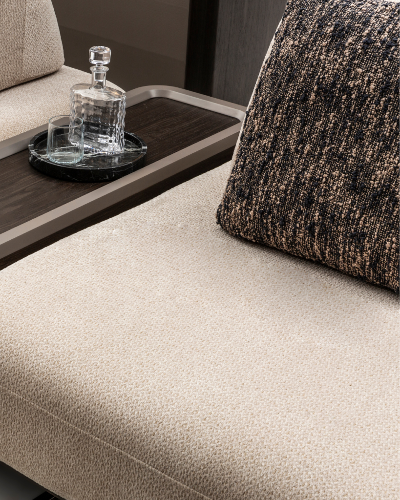 Im Sitzbereich kommt ein elastisches Trampolin-System zum Einsatz, das eine gleichmäßige Federung gewährleistet und den Sitzkomfort nachhaltig unterstützt. Das Hauptsitzpolster besteht aus 10 cm starkem Forta-Schaum mit einer Dichte von 32 DNS, ergänzt durch 5 cm CNC-gefrästen Daunenschaum. Dieser mehrschichtige Aufbau bietet eine ausgewogene Kombination aus stabiler Unterstützung und angenehmer Weichheit. Eine 300 g/m² laminierte Vliesauflage verleiht dem Sitz eine hochwertige Haptik und zusätzliche Komfortschichten.