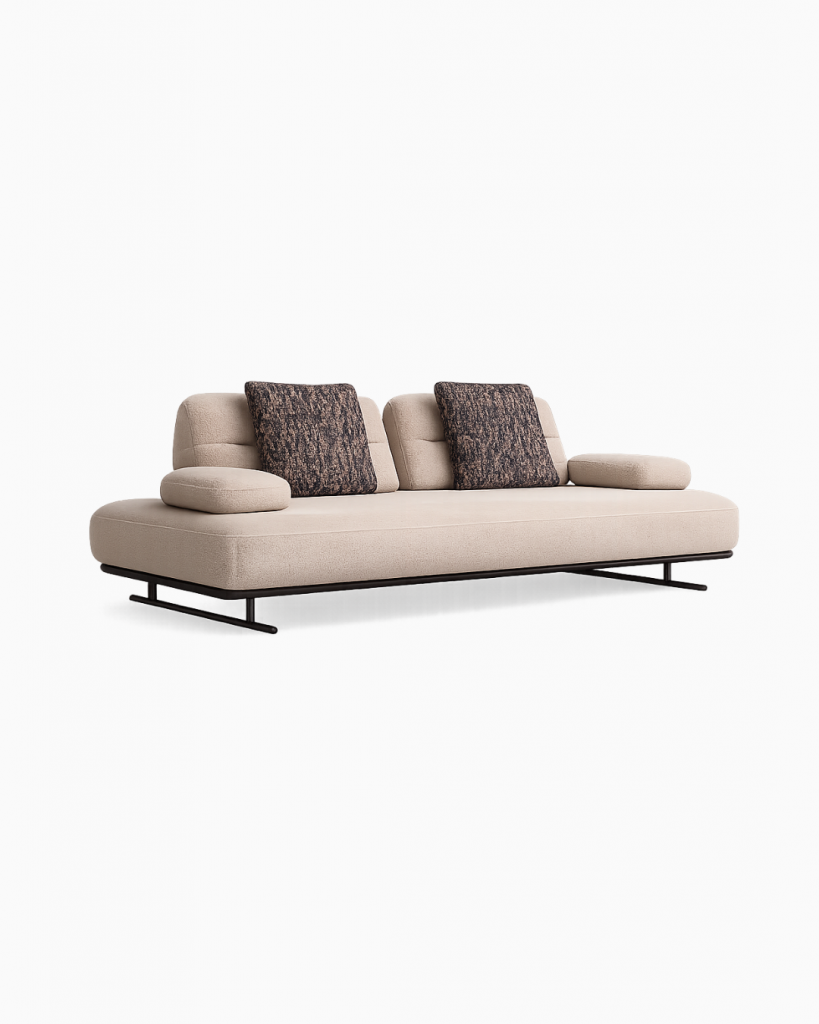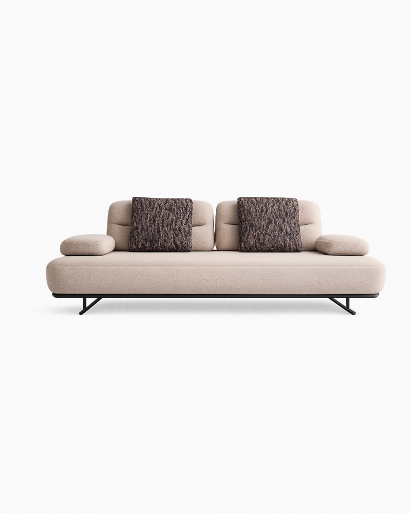 Das Sofa ORCA verbindet funktionales Design mit durchdachter Konstruktion und hohem Komfort. Die klare Linienführung und die ausgewogenen Proportionen verleihen dem Sofa eine moderne, zurückhaltende Ausstrahlung, während seine flexible Bauweise ORCA zu einer vielseitigen Lösung für unterschiedliche Wohn- und Nutzungssituationen macht.  Die tragende Rahmenkonstruktion des Sofas ORCA besteht aus industriell standardisiertem, CNC-gefrästem Sperrholz der 1. Klasse, gezielt verstärkt mit massivem Buchenholz. Diese Materialkombination sorgt für ein optimales Verhältnis von geringem Gewicht und hoher Belastbarkeit sowie für Stabilität, Formbeständigkeit und Langlebigkeit.  Im Sitzbereich kommt ein elastisches Trampolin-System zum Einsatz, das eine gleichmäßige Federung gewährleistet und den Sitzkomfort nachhaltig unterstützt. Das Hauptsitzpolster besteht aus 10 cm starkem Forta-Schaum mit einer Dichte von 32 DNS, ergänzt durch 5 cm CNC-gefrästen Daunenschaum. Dieser mehrschichtige Aufbau bietet eine ausgewogene Kombination aus stabiler Unterstützung und angenehmer Weichheit. Eine 300 g/m² laminierte Vliesauflage verleiht dem Sitz eine hochwertige Haptik und zusätzliche Komfortschichten.  Ein besonderes Merkmal des Sofas ORCA ist die funktionale Konstruktion von Rücken- und Armlehnen, die transporttechnisch separat vom Sitz lösbar sind. Diese Eigenschaft ermöglicht die einfache Umwandlung des Sofas in ein komfortables Einzelbett und erleichtert zugleich Handling, Transport und Logistik.  Das Sofa ORCA steht auf metallischen Füßen mit rauchfarbener Lackierung. Mit einer Höhe von 12 cm und einer Materialstärke von 25 mm sorgen sie für einen sicheren Stand und unterstreichen den modernen Charakter des Sofas. Die Befestigung erfolgt mittels Sternkopfschrauben, vollständig ohne zusätzliche sichtbare Verschraubungen am Produkt.  Bezogen ist das Sofa ORCA mit dem Stoff ARYA, der durch seine angenehme Haptik, Strapazierfähigkeit und zeitlose Optik überzeugt und das klare Design des Sofas harmonisch abrundet.