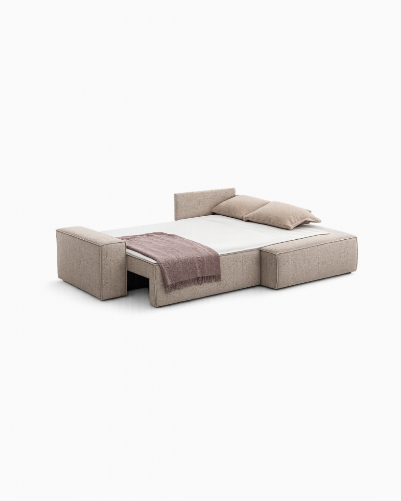 Der Rahmen des Sofas POLA basiert auf einer industriell standardisierten Skelettstruktur aus CNC-geformten, melaminbeschichteten Spanplatten. Diese wird mit massivem Buchenholz der 1. Klasse verstärkt und bildet eine stabile, formbeständige Grundlage mit hoher Belastbarkeit und langer Lebensdauer.