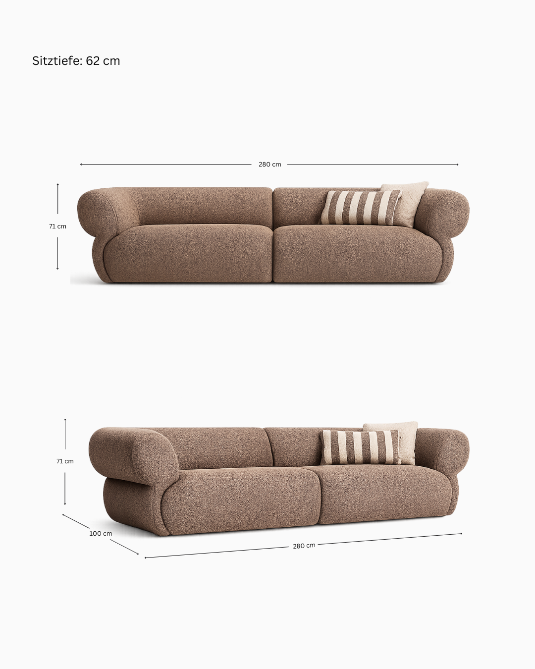 Im Sitzbereich kommt ein elastisches Trampolinbandsystem zum Einsatz, das eine gleichmäßige Federung gewährleistet und den Sitzkomfort dauerhaft unterstützt. Das Hauptsitzpolster besteht aus 14 cm starkem Forta-Schaum mit einer Dichte von 32 DNS, der für solide Stützkraft und angenehmes Sitzen sorgt. Ergänzt wird dieser Aufbau durch 5 cm CNC-gefrästen Schaum mit „Federkern-/Daunen-Effekt“, der dem Sofa seine charakteristische Weichheit und ein besonders komfortables Sitzgefühl verleiht. Eine 300 g/m² laminierte Watteauflage rundet den Sitzaufbau ab und sorgt für eine sanfte Oberfläche sowie ein hochwertiges, voluminöses Erscheinungsbild.