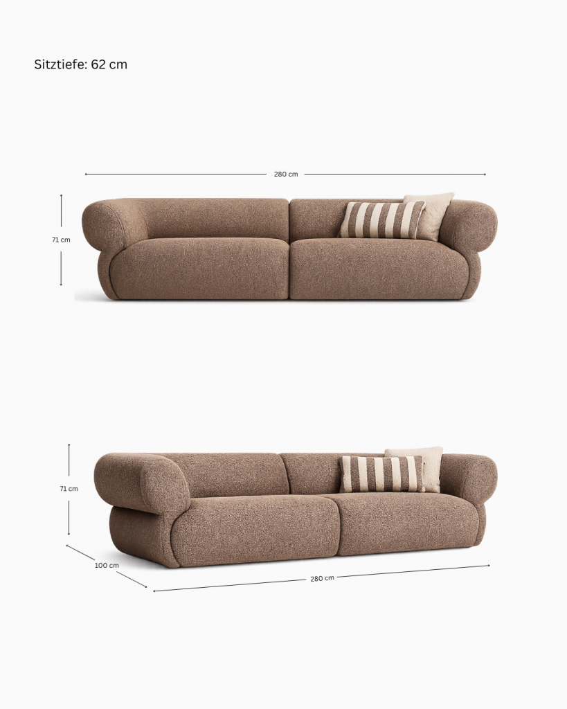Im Sitzbereich kommt ein elastisches Trampolinbandsystem zum Einsatz, das eine gleichmäßige Federung gewährleistet und den Sitzkomfort dauerhaft unterstützt. Das Hauptsitzpolster besteht aus 14 cm starkem Forta-Schaum mit einer Dichte von 32 DNS, der für solide Stützkraft und angenehmes Sitzen sorgt. Ergänzt wird dieser Aufbau durch 5 cm CNC-gefrästen Schaum mit „Federkern-/Daunen-Effekt“, der dem Sofa seine charakteristische Weichheit und ein besonders komfortables Sitzgefühl verleiht. Eine 300 g/m² laminierte Watteauflage rundet den Sitzaufbau ab und sorgt für eine sanfte Oberfläche sowie ein hochwertiges, voluminöses Erscheinungsbild.