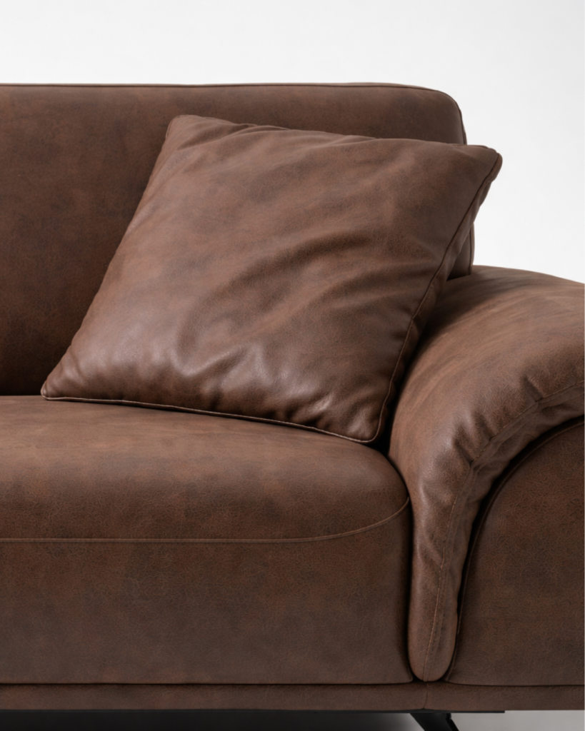 Das Sofa SIENA steht auf pulverbeschichteten Metallfüßen in strukturierter schwarzer Ausführung. Mit einer Höhe von 12 cm verleihen sie dem Sofa eine leichte, moderne Optik und sorgen zugleich für einen sicheren Stand. Die Füße sind stabil mit Sternkopf-Schrauben montiert, vollständig ohne sichtbare Schraubverbindungen, was das klare Design zusätzlich betont.