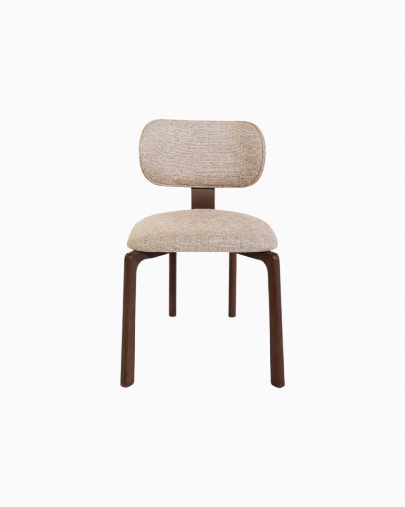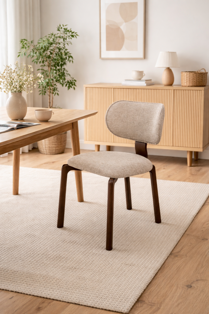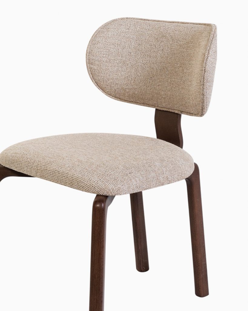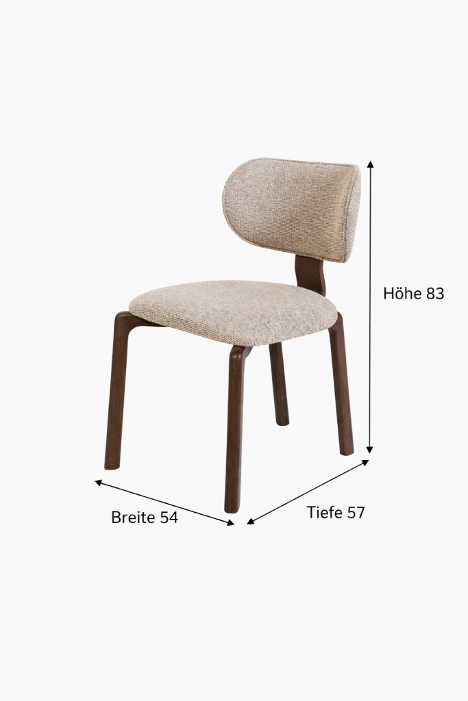 Stilvoller Arco Stuhl mit sanft geschwungener Form und angenehmer Polsterung aus hochwertigem 32-DNS-Schaumstoff. Die ergonomische Sitzfläche sorgt für hohen Komfort, während das Gestell aus massivem Buchenholz und schwarze, genagelte Stuhlbeingleiter dem Design eine elegante und langlebige Ausstrahlung verleihen.
