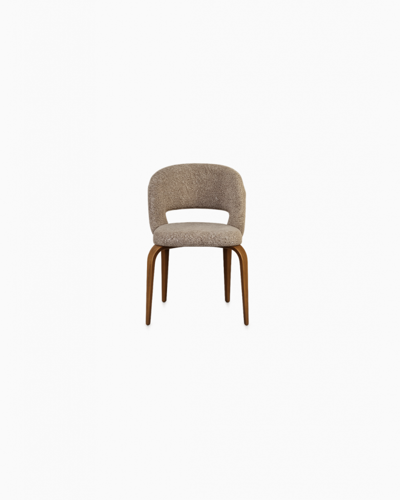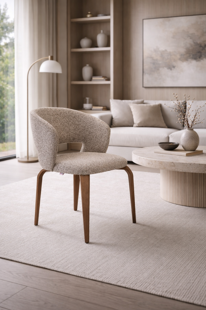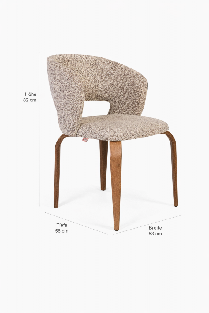 Eleganter Stuhl Notte mit harmonischer Form und komfortabler Polsterung aus hochwertigem 32-DNS-Schaumstoff. Die weich gerundete Rückenlehne sorgt für angenehmen Sitzkomfort, während das Gestell aus massivem Buchenholz dem Design eine warme, natürliche Note verleiht. Schwarze, genagelte Stuhlbeingleiter runden die hochwertige Verarbeitung stilvoll ab.