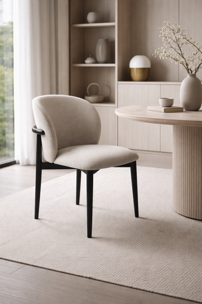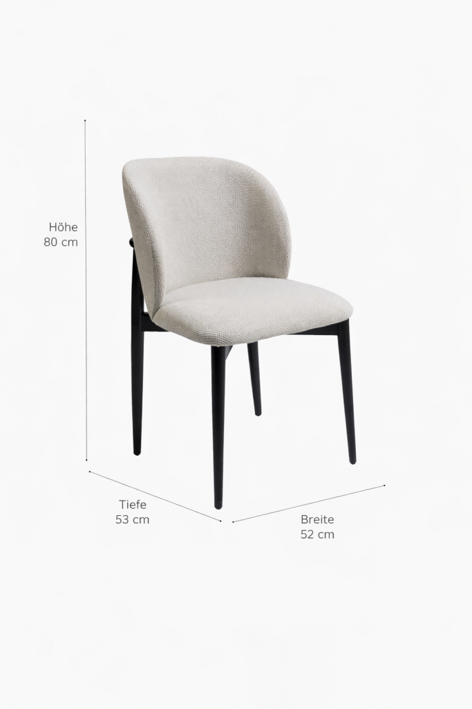 Moderner Stuhl Orbita mit weicher, ergonomisch geformter Sitzschale und komfortabler Polsterung aus hochwertigem 32-DNS-Schaumstoff. Die klaren Linien und das Gestell aus massivem Buchenholz sorgen für sicheren Halt, während schwarze, genagelte Stuhlbeingleiter dem Design eine elegante und hochwertige Note verleihen.