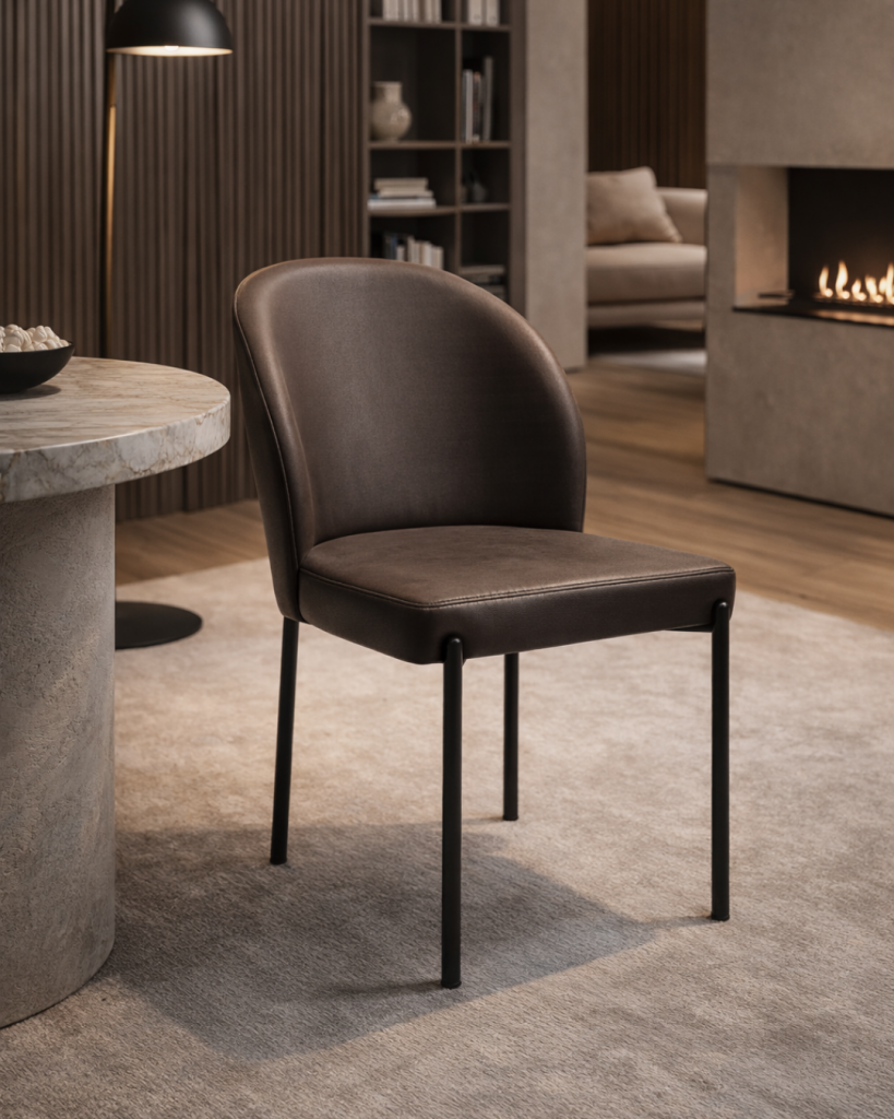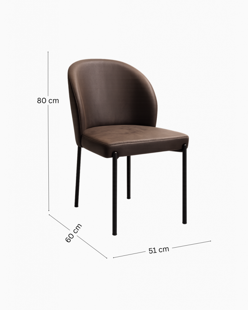 Moderner Stuhl Perla mit sanft gerundeter Form und komfortabler Polsterung aus hochwertigem 32-DNS-Schaumstoff. Die ergonomische Sitzfläche bietet angenehmen Halt, während das schlanke Metallgestell für Stabilität und Leichtigkeit sorgt. Schwarze, genagelte Stuhlbeingleiter unterstreichen das hochwertige und zeitlose Design.