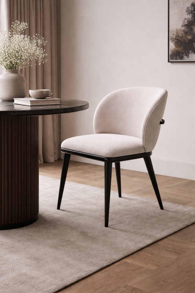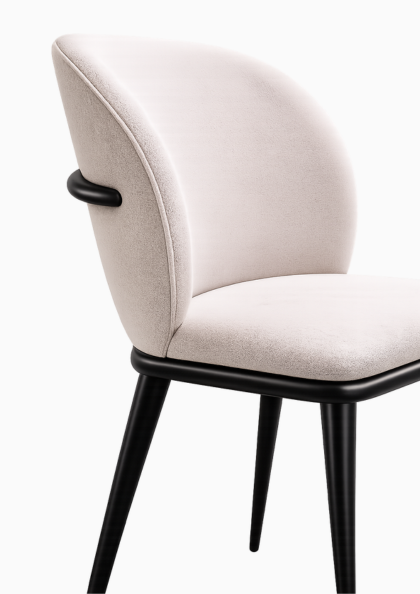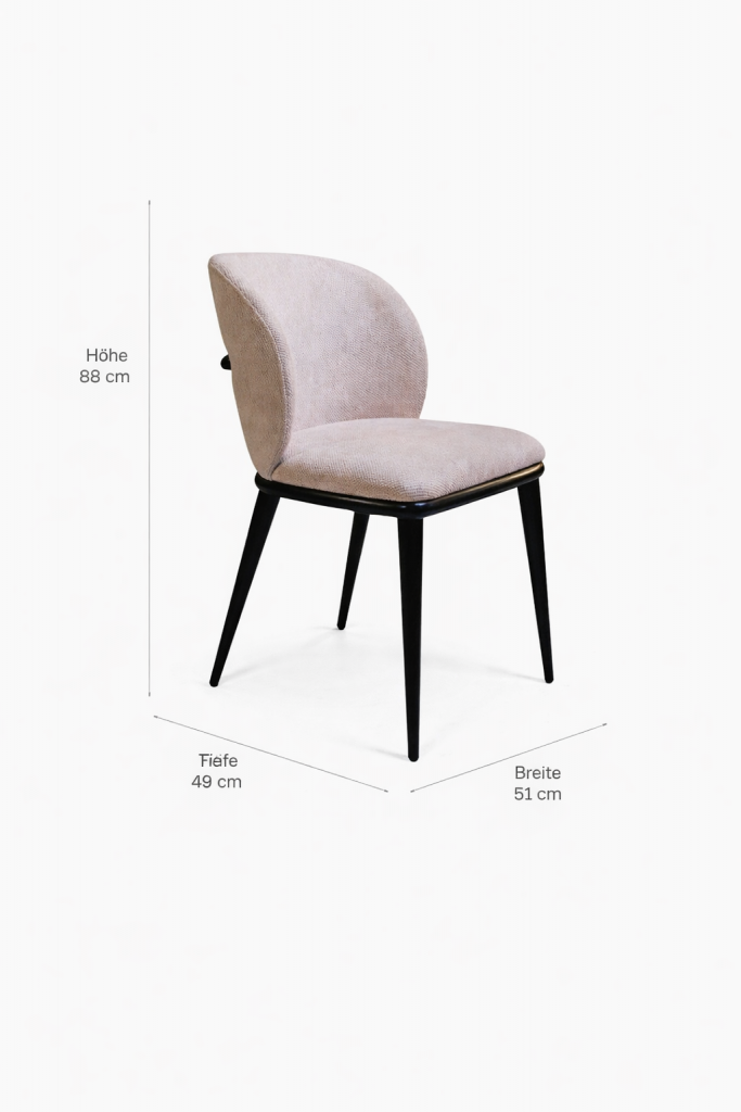 Moderner Stuhl Trave mit weich gepolsterter Sitz- und Rückenfläche aus hochwertigem 32-DNS-Schaumstoff. Die ergonomische Form sorgt für hohen Sitzkomfort, während das Gestell aus massivem Buchenholz und schwarze, genagelte Stuhlbeingleiter dem Design eine elegante und langlebige Ausstrahlung verleihen.
